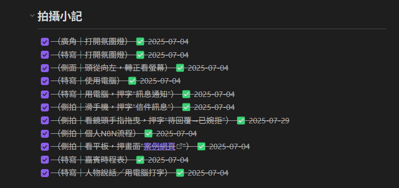 - 檢查清單:按照腳本逐一確認每個鏡頭