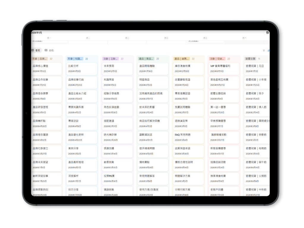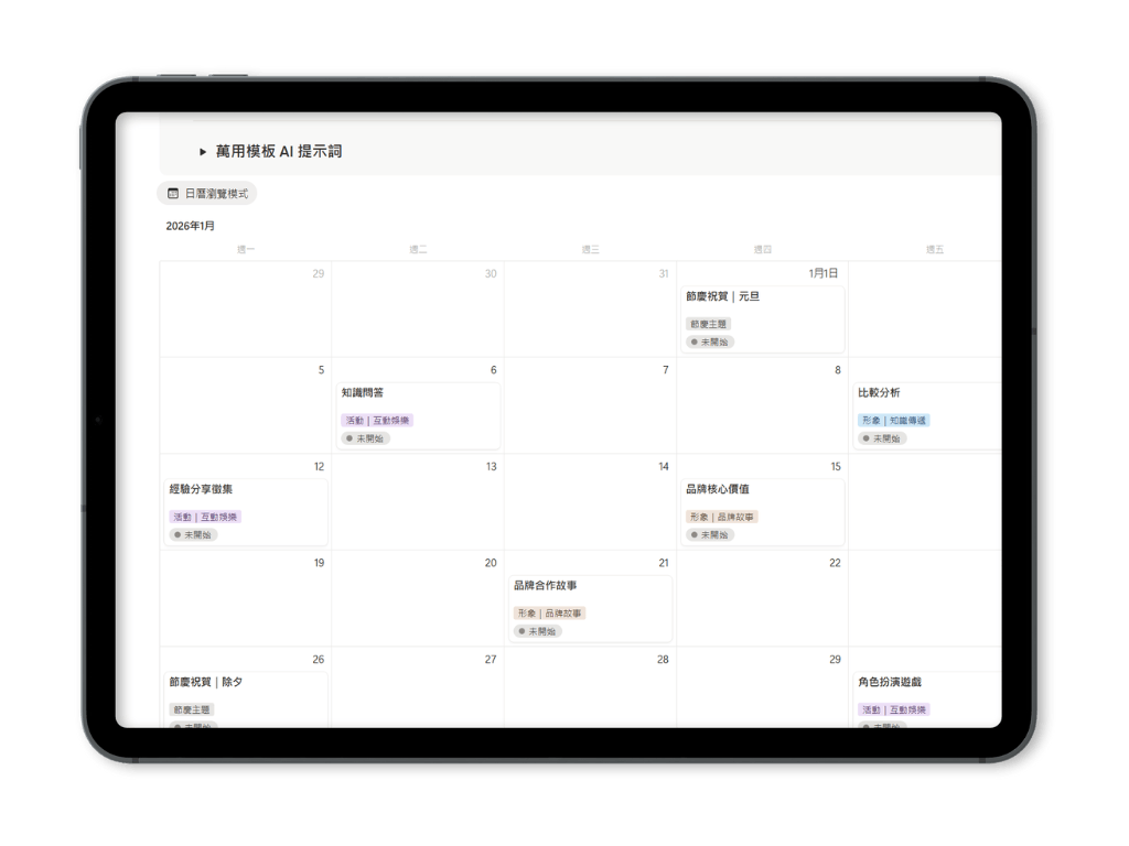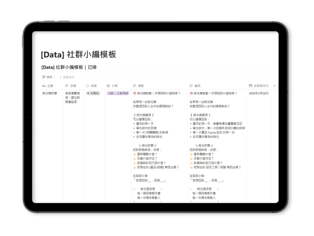 6 大主題 × 各22款模板 社群小編發文神器一年份社群貼文模板 你也常遇到以下問題嗎? 要發文卻想不到主題 AI 寫的貼文不夠精準 文案排版好讓人苦惱 立刻獲得132款貼文模板 幫助你省下更多時間 發文神器解決你的問題 What You’ll Gain 1年份發文日曆 幫你規劃全年時程 Notion 系統 清楚掌握貼文進度 132款文案模板 任何產業都能使用 AI 提示詞 輕鬆產出貼文初稿 資源盤點模板 系統化整理品牌資源 爆款標題包 提完整句式&範例 立刻獲得132款貼文模板 平均一杯手搖的錢,買出自己的時間 內容資源 Templates 01 132款萬用貼文文案 任何產業都能使用,涵蓋品牌形象、知識傳遞、商品展示、銷售導購、促銷到互動。 02 1年份發文月曆 ✦Notion + Google Sheet版✦幫你規劃全年份貼文時程✦彈性調整發文日期、內容 03 Notion 貼文管理系統 ✦支援看板、日曆拖曳管理✦用狀態標籤掌握貼文進度✦篩選器快速過濾主題類型 04 Canva 資源盤點模板 ✦系統化整理品牌資源✦找到內容創作靈感來源✦提升社群經營效率 05 54+ 爆款標題懶人包 ✦54款爆款影片標題、Hook✦可應用到貼文文案開頭✦提供完整中文句式、範例 Hello! 我是Annie ✦ 創作者/一人公司/自由工作者✦ 經營個人品牌部落格與社群✦ 數位商品好評銷售破百份✦ 曾受邀至多個單位擔任講師✦ 著《剛剛好的 Canva 設計教本》✦ Canva官方認證的推廣大使 自 2017 年起便投入設計領域,從設計轉職自由接案,靠著內容經營打造了個人品牌,也是 Canva 教學創作者與數位產品販售者,出版過設計教學書籍《剛剛好的 Canva 設計教本》。 目前專注於內容設計、Canva 模板製作與社群經營教學,希望讓更多一人創業者,找到適合自己的創作節奏與商業模式。 以下是我在 Instagram 分享的部分內容 現在只要 $990 每月一杯手搖的錢,省出時間 萬用模板,買一次就可持續用 不用每次都從 0 開始 不再因沒有靈感卡關 不再花時間重新規劃 立刻獲得132款貼文模板 幫助你省下更多時間 現在買要等到 2026 才可以用嗎? 不用等!現在就可以使用~✦ 發文日曆為參考,可以自行調整時間✦ 模板內容是萬用的,可不限時間使用 檔案中包含哪些主題分類? 6大主題分類各22款,共132種模板形象|品牌故事:建立品牌認知、情感連結形象|知識傳遞:專業科普、迷思破解、教學分享產品|商品展示:功能介紹、使用情境、開箱體驗產品|銷售導購:促銷活動、優惠資訊、購買引導活動|促銷折扣:節慶行銷、限時優惠、會員專屬活動|互動娛樂:粉絲互動、投票活動、話題討論 132種模板夠用嗎? 絕對夠用!每個模板都可以反覆使用,調整不同內容就會有不同變化,132種模板綽綽有餘~ 買了之後要怎麼下載?會是什麼形式? 提供 Notion & Google Sheet 雙版本電子檔:線上直接使用,隨時更新購買後立即交付,無需等待Notion|整合可拖曳貼文管理系統Google Sheet|適合沒有 Notion 的人使用 模板的填空欄位,會不會不知道怎麼填? 完全不用擔心!每個模板都有明確填寫指示,並提供完整範例參考,看一遍就會用。還有提供 AI 輔助提示詞,能讓 AI 幫你生成初稿。 如何根據不同產業調整模板內容? 模板本身具備高度彈性,適用各種產業。✦ 提供AI 輔助提示詞,輕鬆填入品牌資料就能生成初稿✦ 模板 = 無限變化,填入不同內容就是全新文案 用了模板,會跟其他人看起來一樣嗎? 不會!模板只是架構框架,填入內容後完全不同~你的品牌名稱、產品特色、目標客群都是獨一無二的同一個模板可以反覆使用,每次調整內容就是新文案 為什麼不把文案寫好,還要自己填內容? 填空式設計是為了讓你快速產出,但同時保有獨特性的作法。不同產業有不同的用詞習慣和客群,這樣能確保你的文案不會與其他人重複、更符合你的品牌調性。